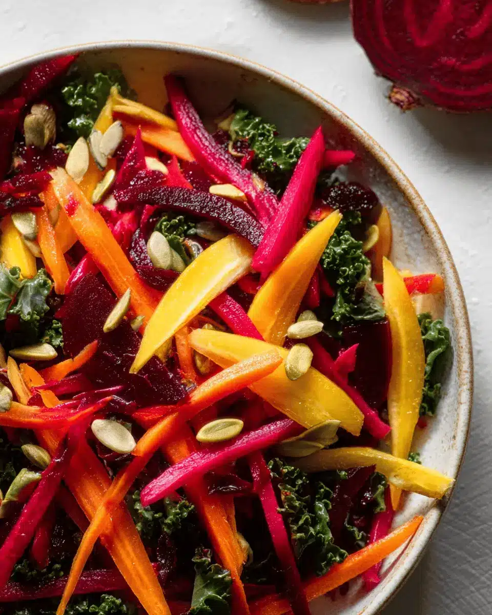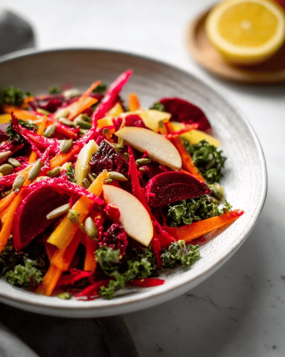 For a final touch, sprinkle your salad with pepitas or sunflower seeds before serving. This adds both crunch and nutrition. Spoon the Apple Beet Carrot Kale Salad into individual bowls or serve from a large bowl at the table—it’s sure to impress!