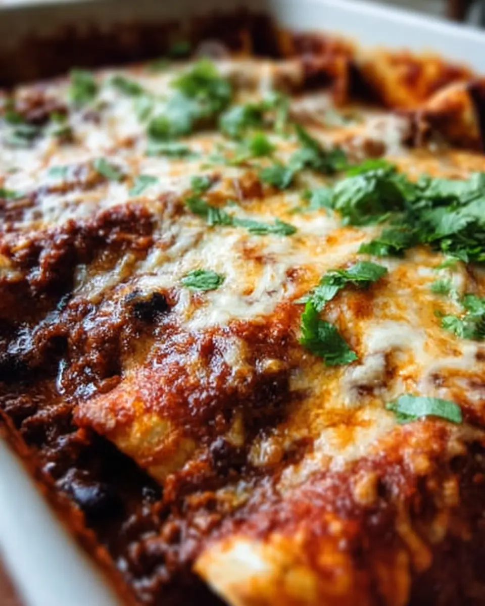 Pour the remaining enchilada sauce over your assembled enchiladas and top them generously with cheese—Monterey Jack or cheddar works beautifully. Cover the dish with foil and bake for about 10 minutes. Then, remove the foil and bake for another 10 minutes until the cheese is bubbly and golden. Your beef enchiladas are now ready to be served—garnish with fresh cilantro for that finishing touch!