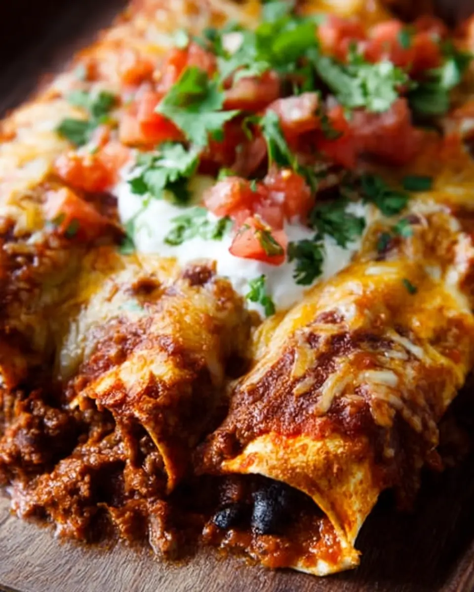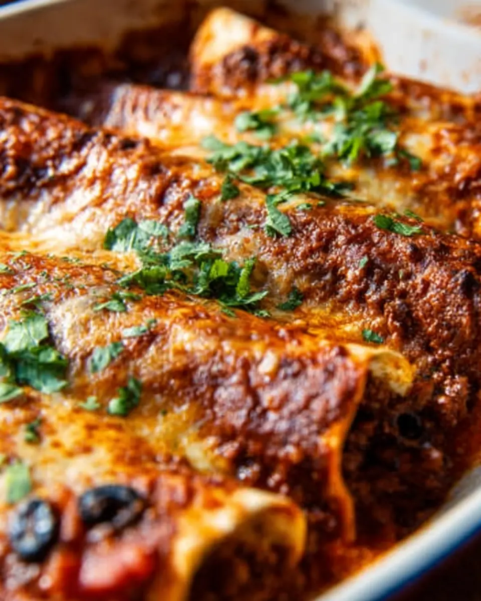 You're almost there! Preheat your oven to 180°C (350°F). Spread a thin layer of enchilada sauce at the bottom of a baking dish to prevent sticking. Take your tortillas and place a generous amount of the beef filling on the lower third of each. Roll them tightly and place them seam-side down in the dish. Repeat until all filling and tortillas are used up.
