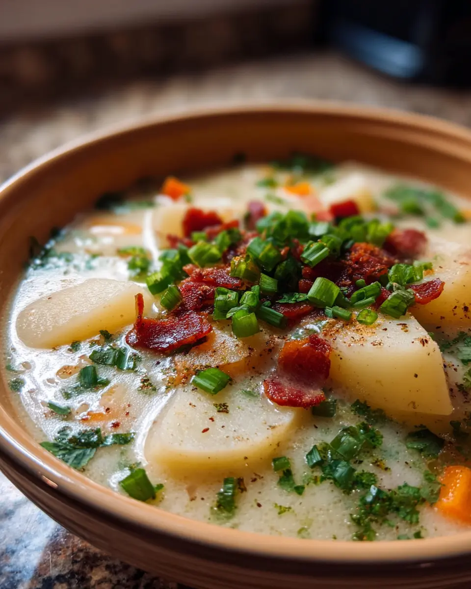 Finally, ladle your potato soup into bowls and garnish with sliced green onions, fresh parsley, and crumbled turkey bacon if you choose. Serve hot, and enjoy the comforting warmth of your homemade creation!