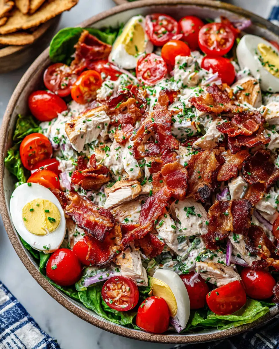 In a medium-sized bowl, combine the star players of your salad: shredded chicken, crispy turkey bacon, vibrant tomatoes, diced red onion, and fresh chives. Give them a gentle toss to evenly distribute everything. This mix not only tastes amazing, but it’s visually appealing with all the colors coming together. If you’re looking for even more flavor, consider adding a dash of your favorite seasoning or some chopped herbs!