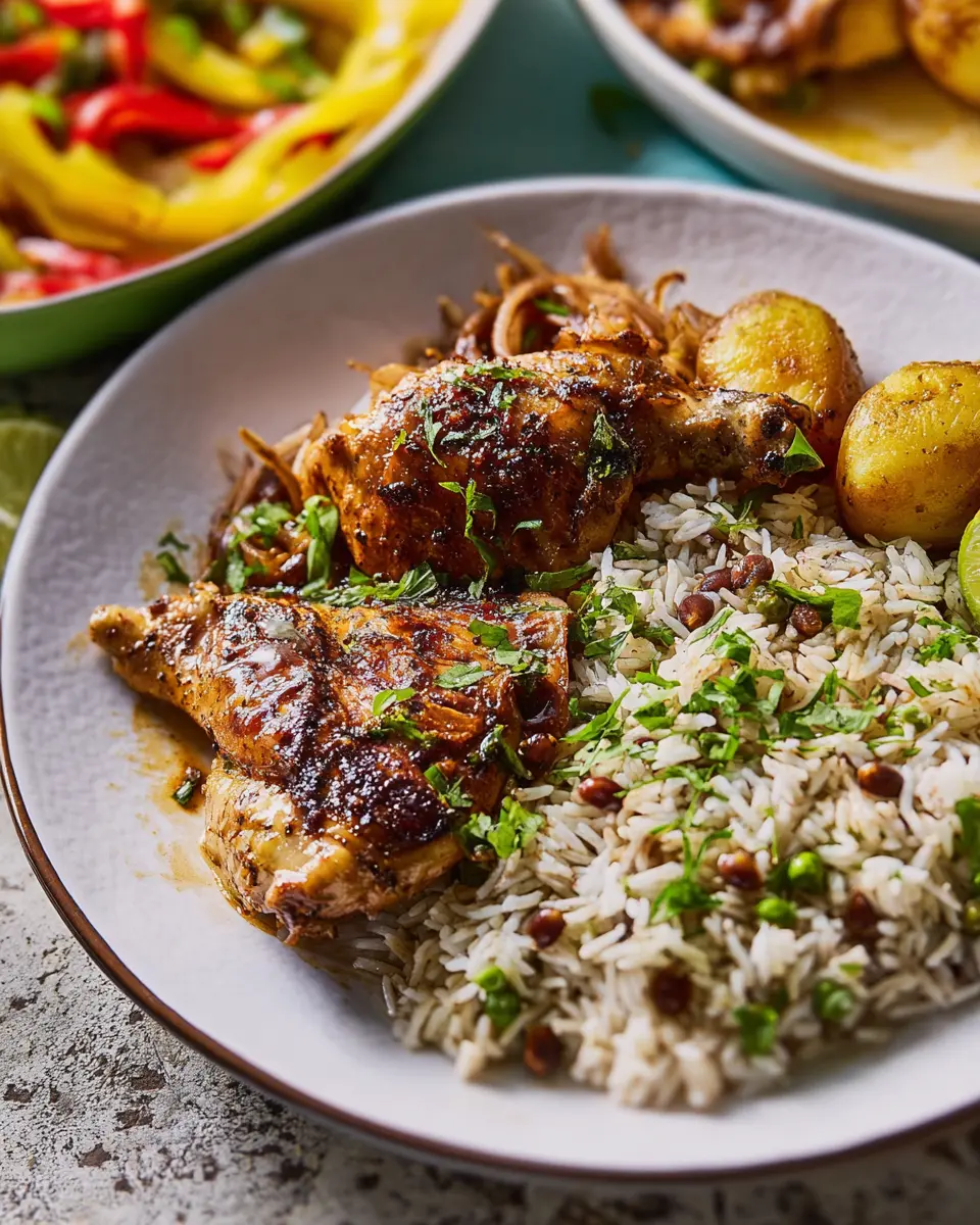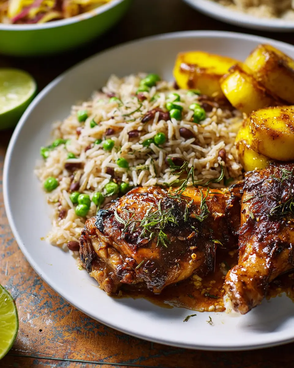 Creating an inviting plate is all about color and contrast. Serve the chicken atop a bed of fluffy rice and peas, letting the rich, golden-hued gravy drizzle enticingly over it. Surround this with a generous scoop of slaw and a side of fried plantains for a burst of color. Garnish with fresh herb sprigs or lime wedges for an extra pop that invites your guests to dig in. Presenting your Caribbean chicken with rice and peas in this way not only pleases the palate but also the eyes!
