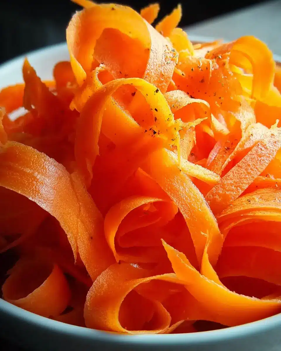 - Using a vegetable peeler, shave the carrots lengthwise into thin ribbon-like strips and place them in a bowl.