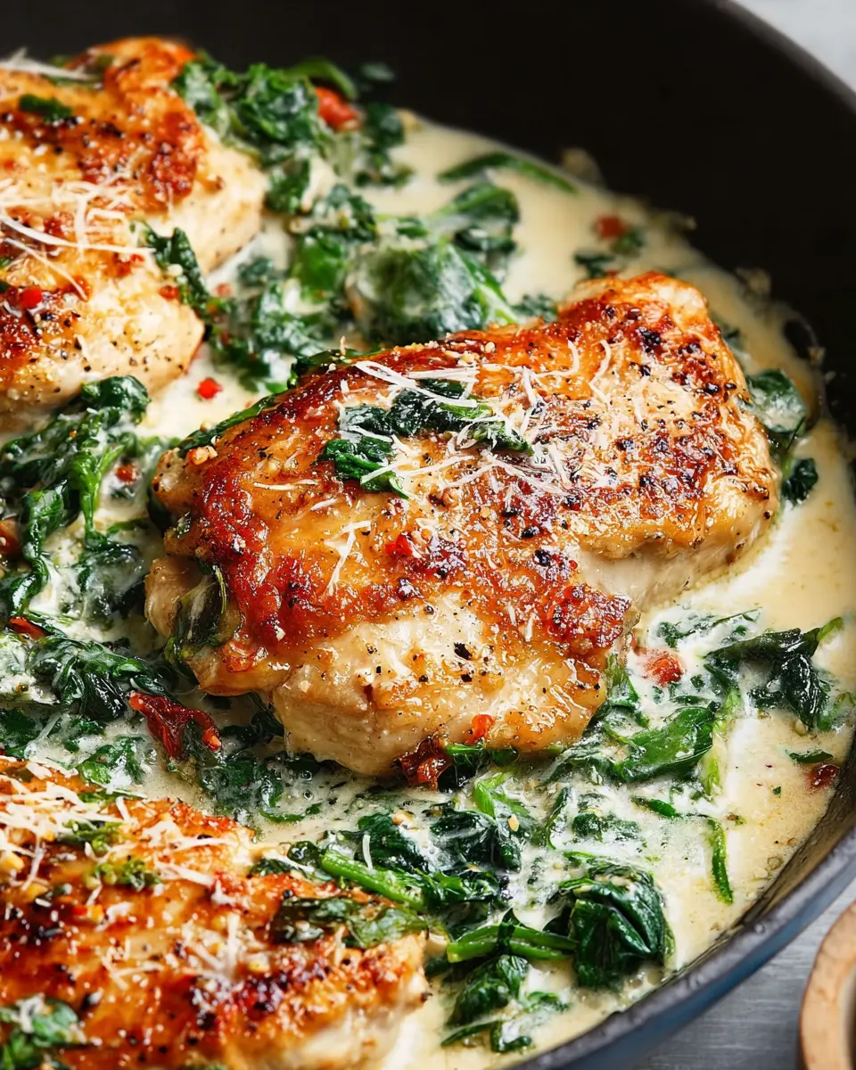 To complete your Chicken Florentine, stir in 3 cups of fresh baby spinach, allowing it to wilt into the creamy sauce. Once combined, return the chicken to the skillet, rolling it in the sauce until every piece is well-coated. Finally, mix in grated Parmesan cheese for that extra layer of tasteful richness. Let everything simmer on low until the chicken reaches an internal temperature of 165°F.