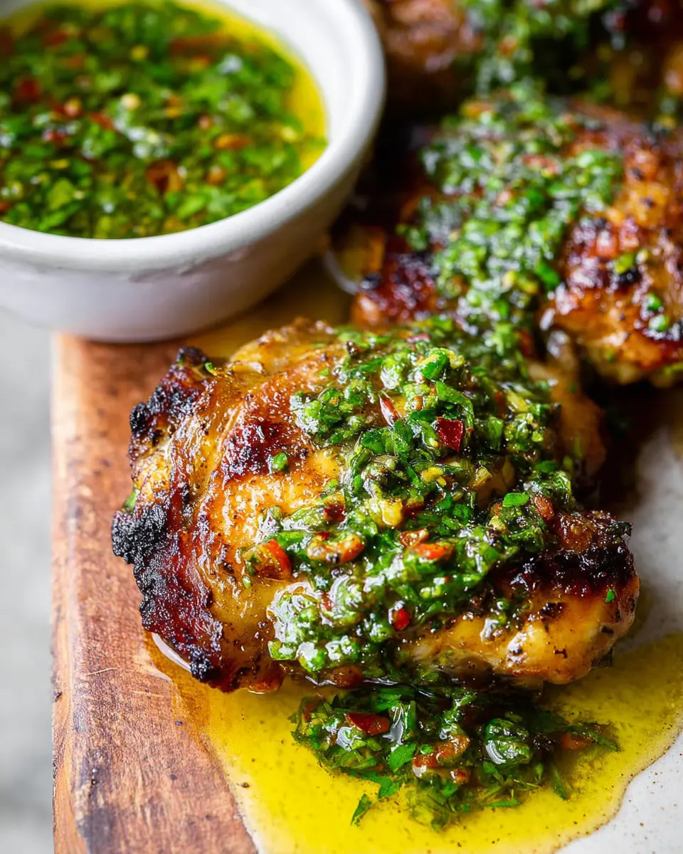 After grilling, let the chicken rest for a couple of minutes. This helps to lock in the juices. When ready to serve, plate the chicken thighs and drizzle any remaining chimichurri sauce over the top. You can also serve extra chimichurri on the side for dipping. Enjoy your flavorful chimichurri chicken thighs with a side of grilled vegetables or a fresh salad.