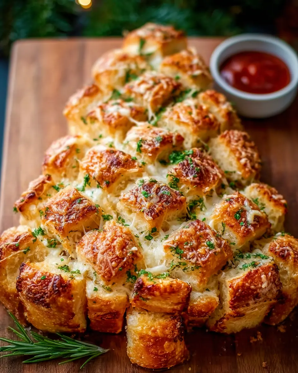 Once your Christmas Tree Pull-Apart Bread is out of the oven, brush it with melted butter and sprinkle it with fresh parsley and grated parmesan cheese for added flavor. Serve immediately alongside a warm marinara sauce for dipping. It’s sure to be a hit at your holiday gatherings and a delightful way to keep the spirit of togetherness alive!