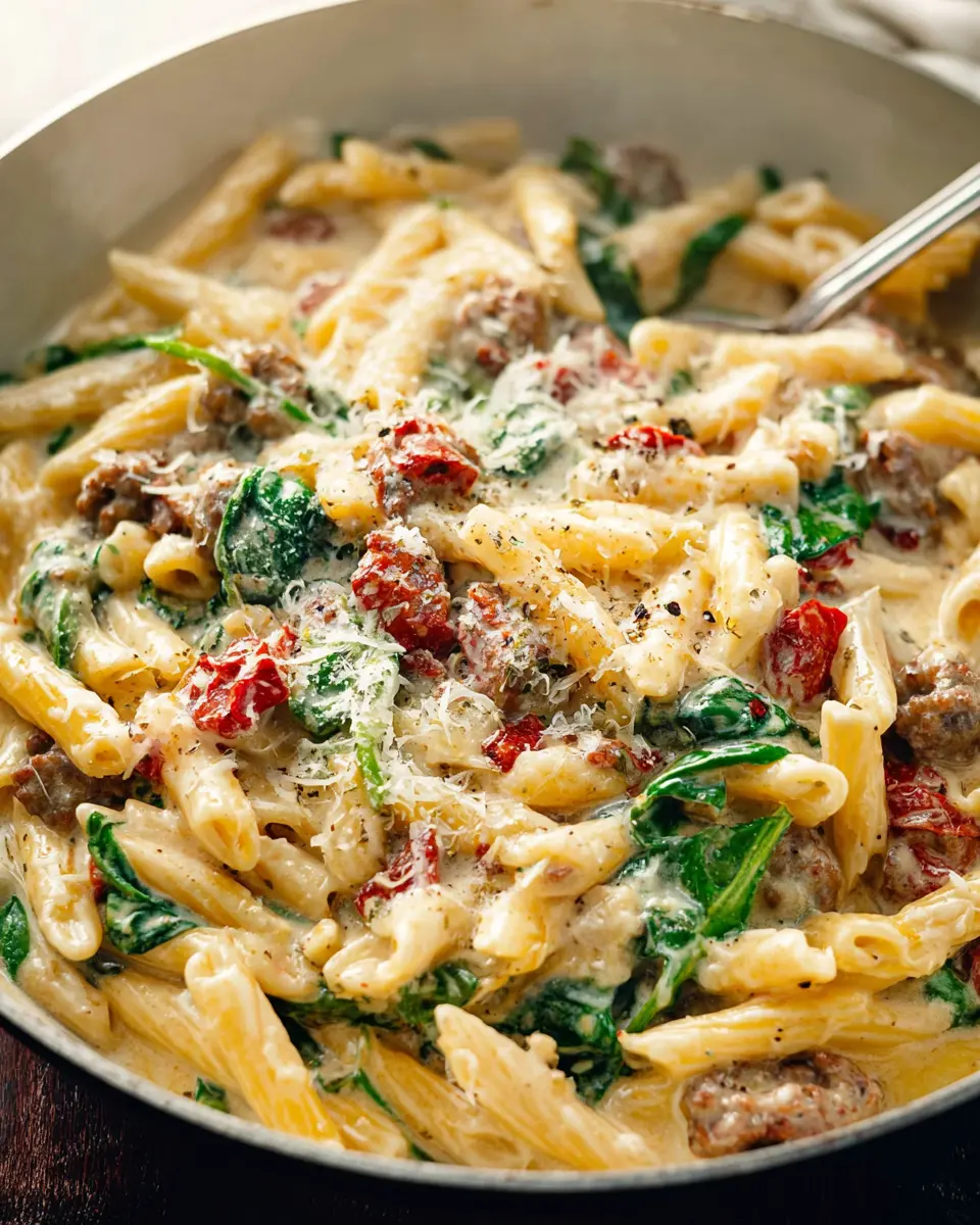 For an added layer of texture and flavor, it’s time to toss in the vegetables. Stir in 2 cups of chopped spinach and ½ cup of sun-dried tomatoes. As they mingle with the sauce, the spinach will begin to wilt in just a few minutes, adding vitality and bright color to your creamy Tuscan sausage pasta. The sun-dried tomatoes not only bring a tangy sweetness but also contribute to a Mediterranean flair.