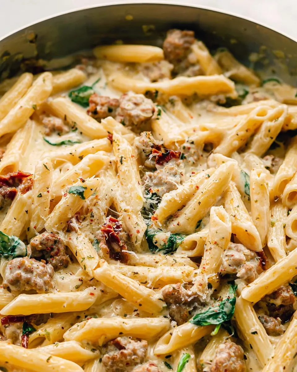 Preparing this dish is a breeze. You start with penne pasta cooked to perfection, then mix in ground sausage, fresh spinach, and sun-dried tomatoes for a vibrant color palette and burst of flavor. The heavy cream and Parmesan cheese meld together to create a luxurious sauce that clings beautifully to the pasta. Plus, it all comes together in just one pan, so you can spend less time cleaning and more time enjoying dinner with loved ones.