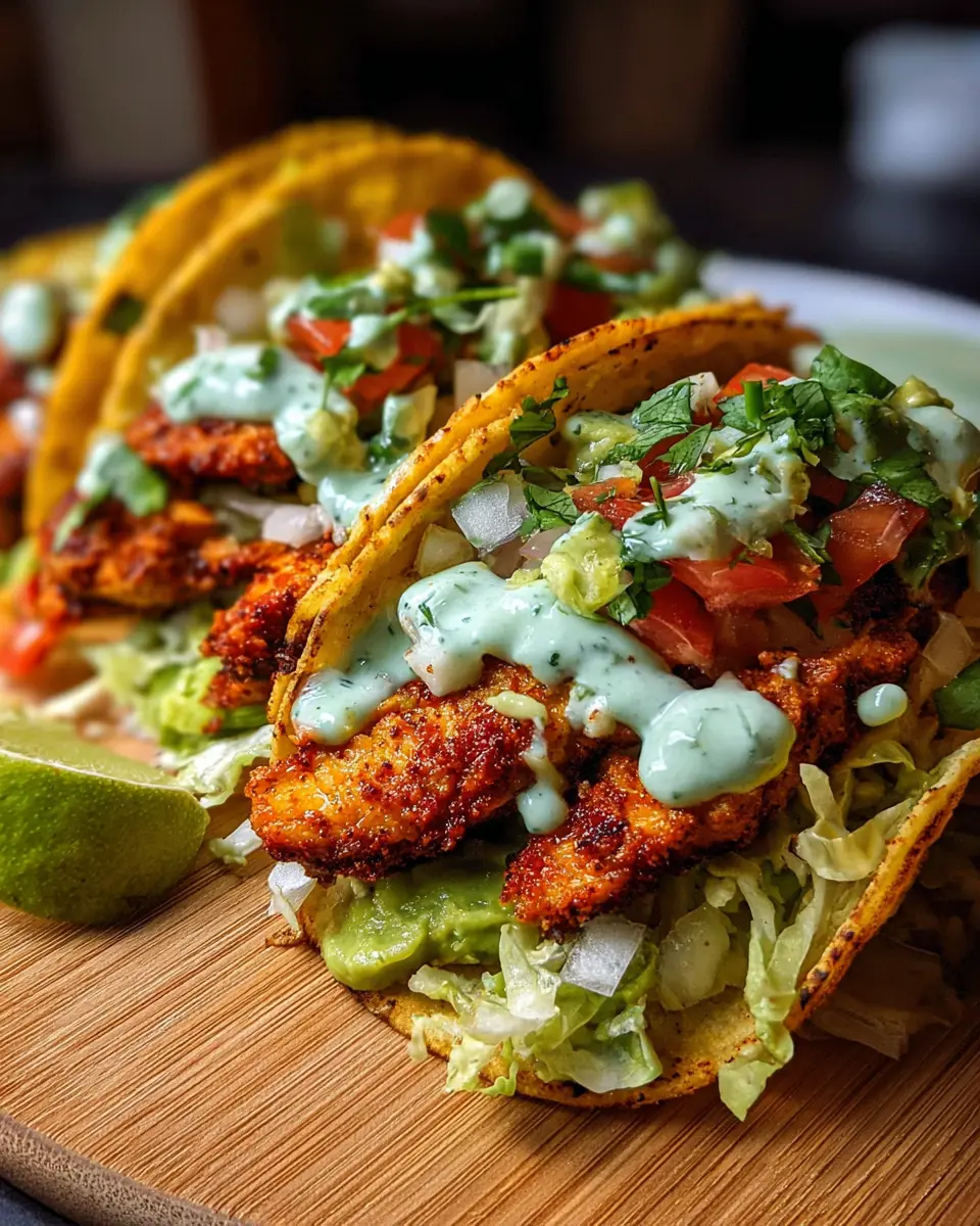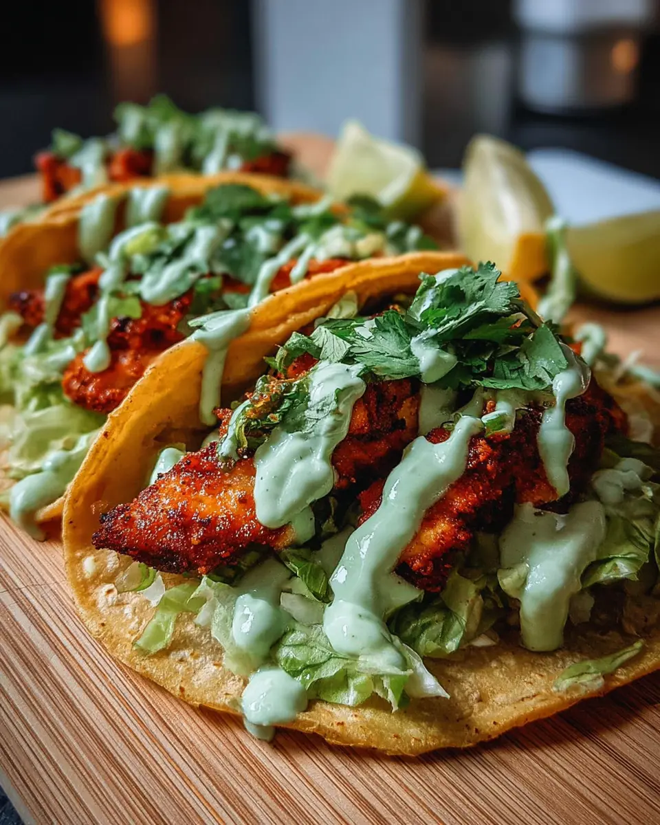 Now comes the fun part: assembling your tacos! Chop the crispy chicken into bite-sized pieces. On each warm tortilla, layer your chopped chicken, add some shredded cabbage, drizzle with that lush avocado crema, and sprinkle with chopped cilantro. Finish with fresh lime wedges on the side for an extra zing! Serve immediately and watch everyone dig in.