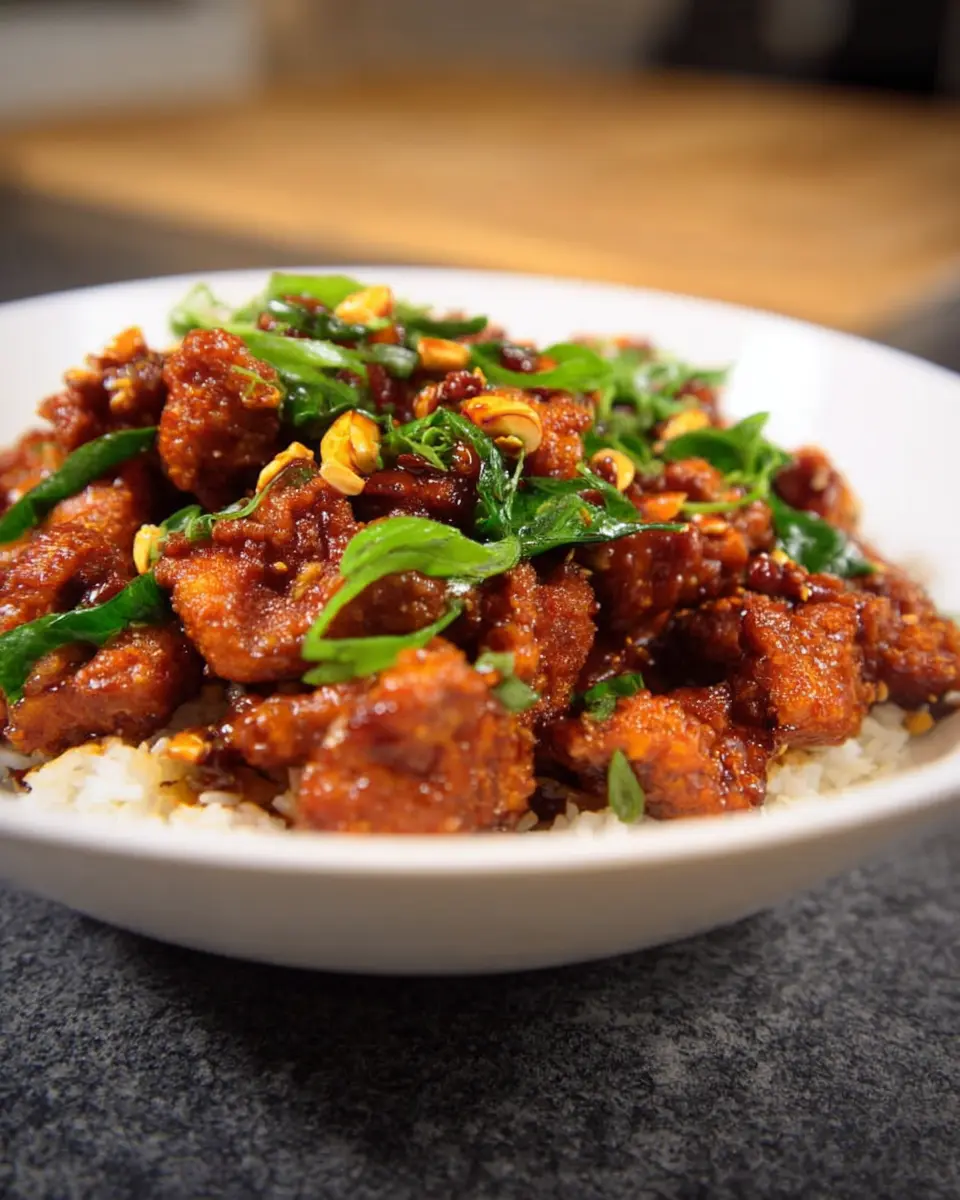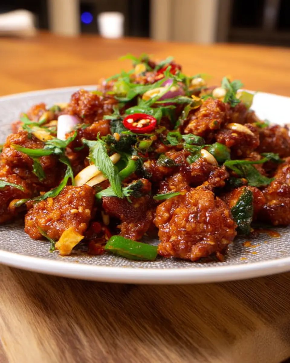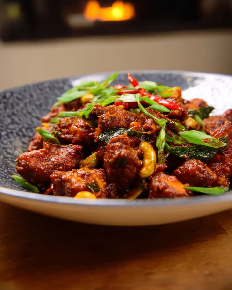 Finally, let’s bring it all together! Add the fried chicken, toasted cashews, and any optional ingredients like sliced green pepper to the sauce. Toss everything together gently, ensuring that the chicken is well-coated. Finish with chopped coriander and spring onions for a fresh touch!