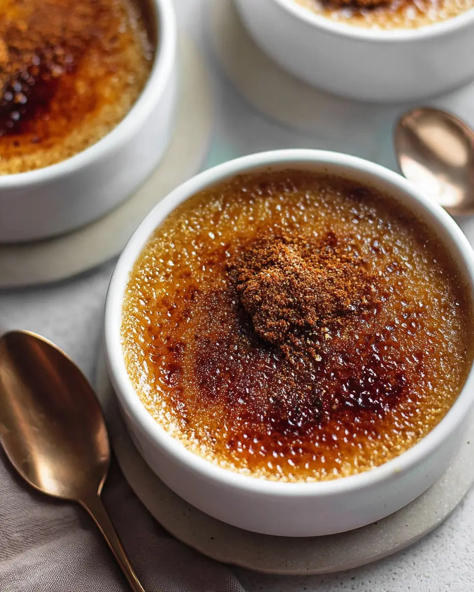 Just before serving, sprinkle an even layer of sugar over the surface of each ramekin. Using a kitchen torch, carefully caramelize the sugar until it forms a golden crust. Keep the flame moving to avoid burning the sugar. Let it rest for a few minutes, and voilà—you have a perfectly crispy topping!