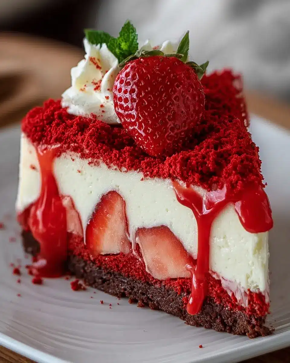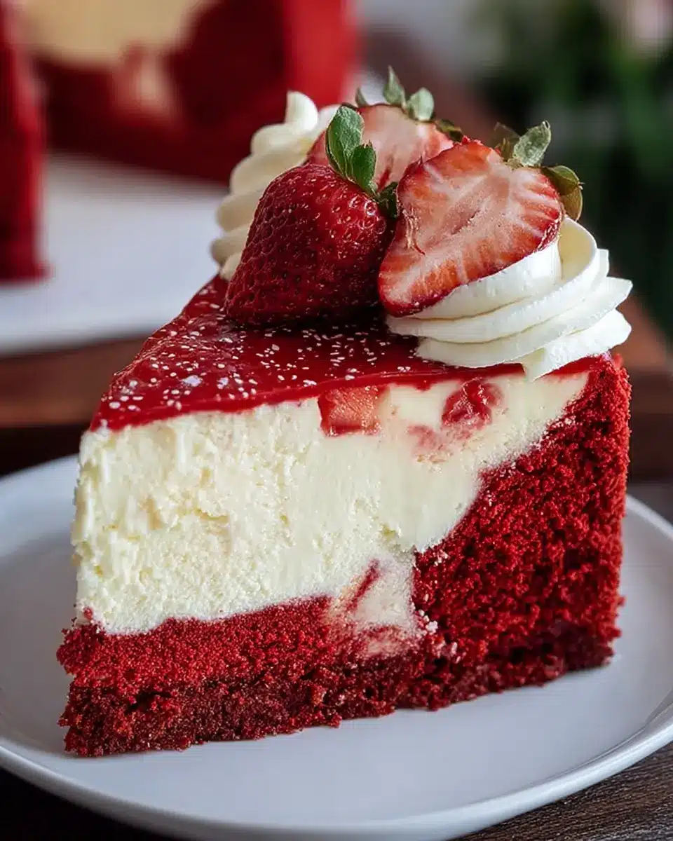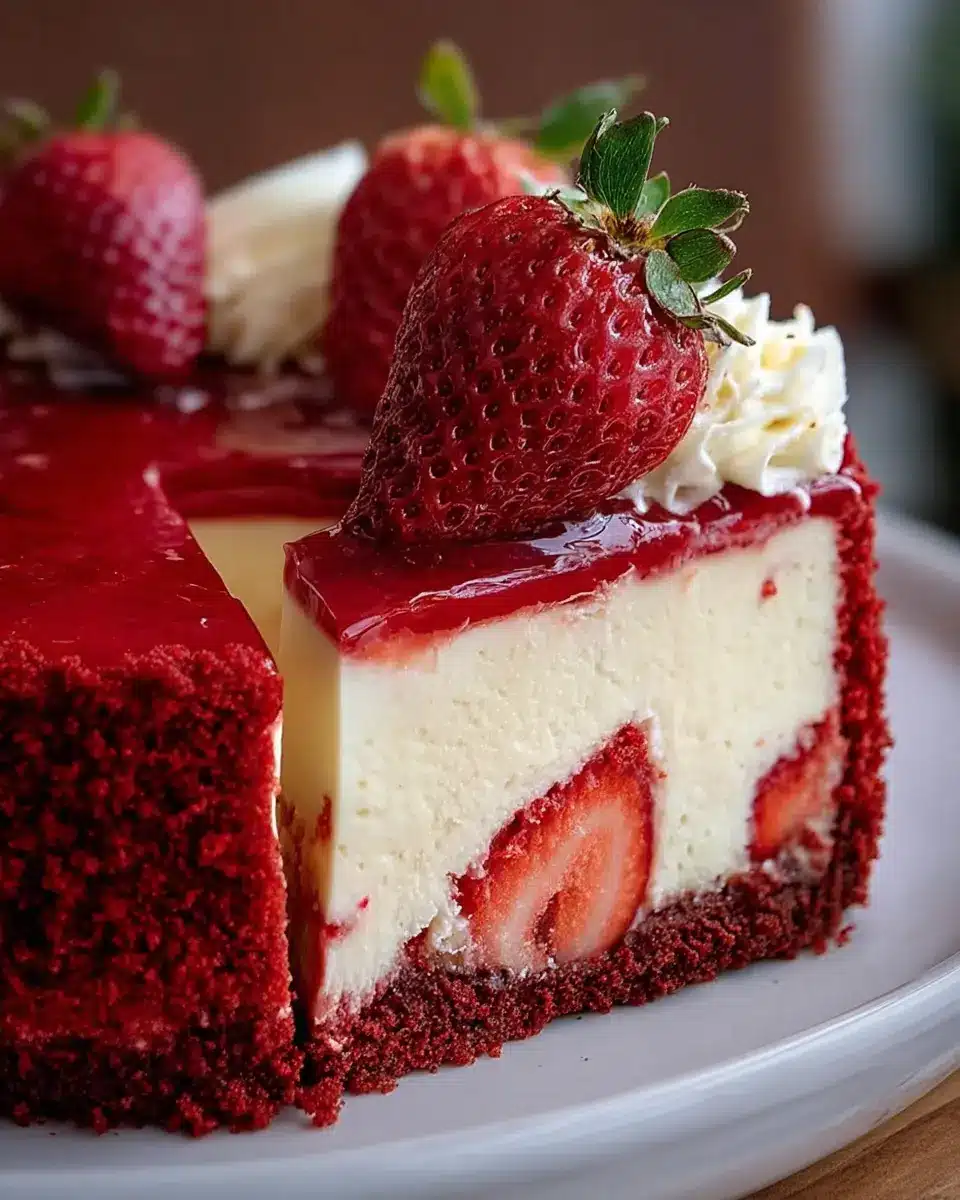This recipe is both simple and striking, making it a wonderful addition to your culinary repertoire. The velvety red crust lays a delightful foundation for a dreamy cheesecake layer, while the fresh strawberry topping adds a burst of color and flavor.
