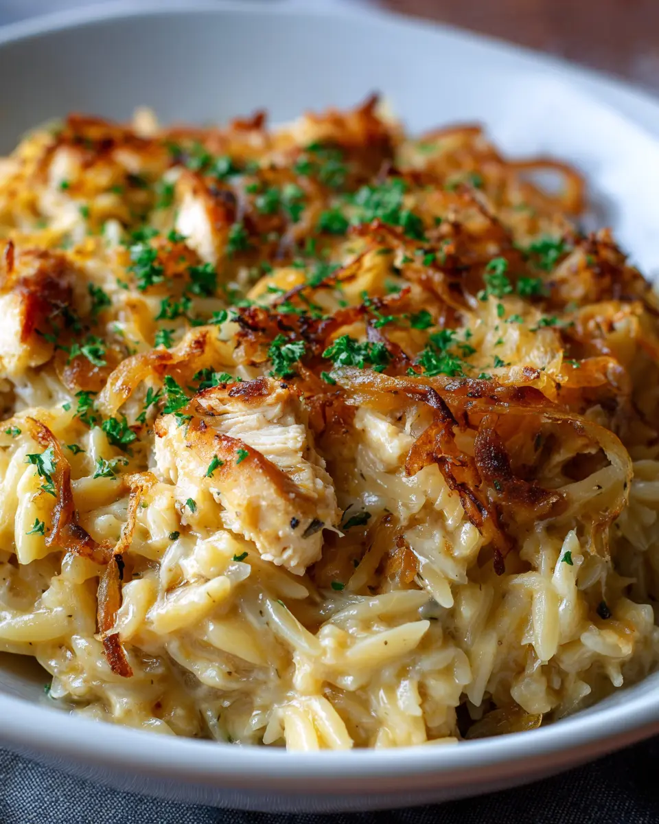 French Onion Chicken Orzo Casserole