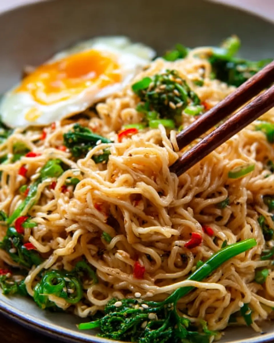 Your garlic noodles are now ready to serve! Plate them hot, and if you’re feeling fancy, top them with a perfectly fried egg and some broccolini for added nutrition and flavor.