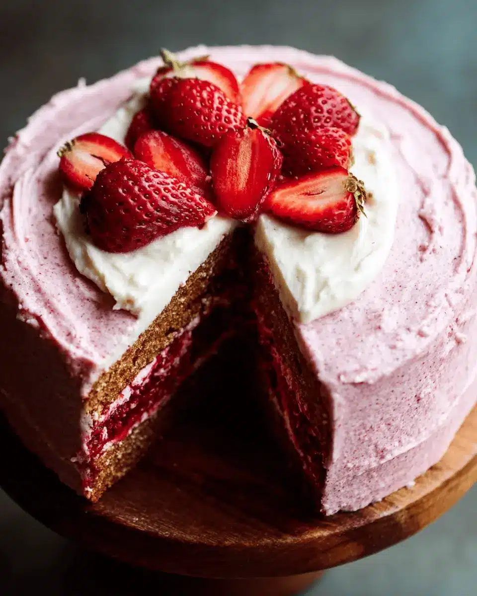 Finish by generously frosting the top and sides with the remaining strawberry frosting. Allow the assembled cake to chill a little more before slicing into it — this helps keep the shape intact.
