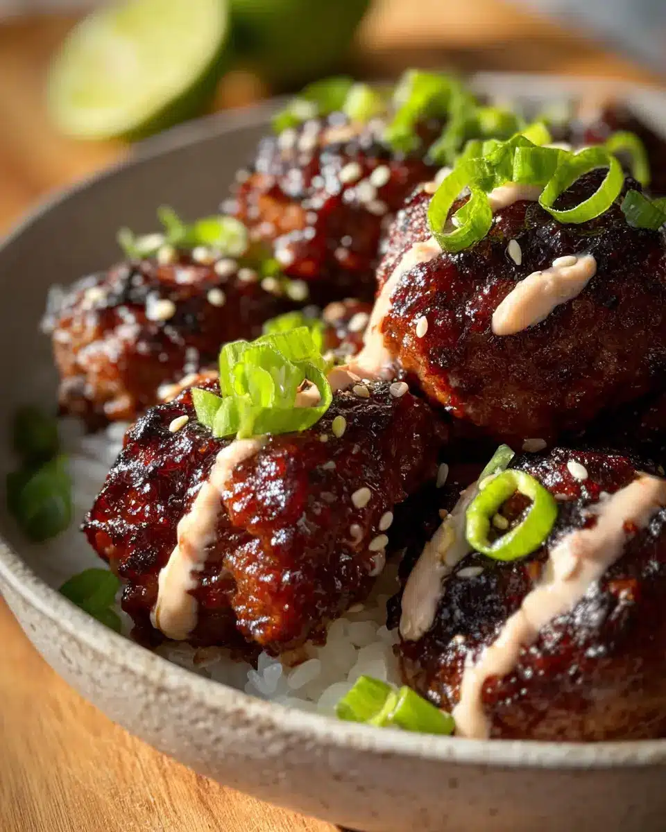 Finally, it’s time to serve! Place your Korean BBQ meatballs on a platter, generously drizzle with the spicy sesame mayo, and finish off with a sprinkle of sliced green onions and sesame seeds. This presentation not only looks gourmet but also enhances the flavor. Enjoy your culinary creation!