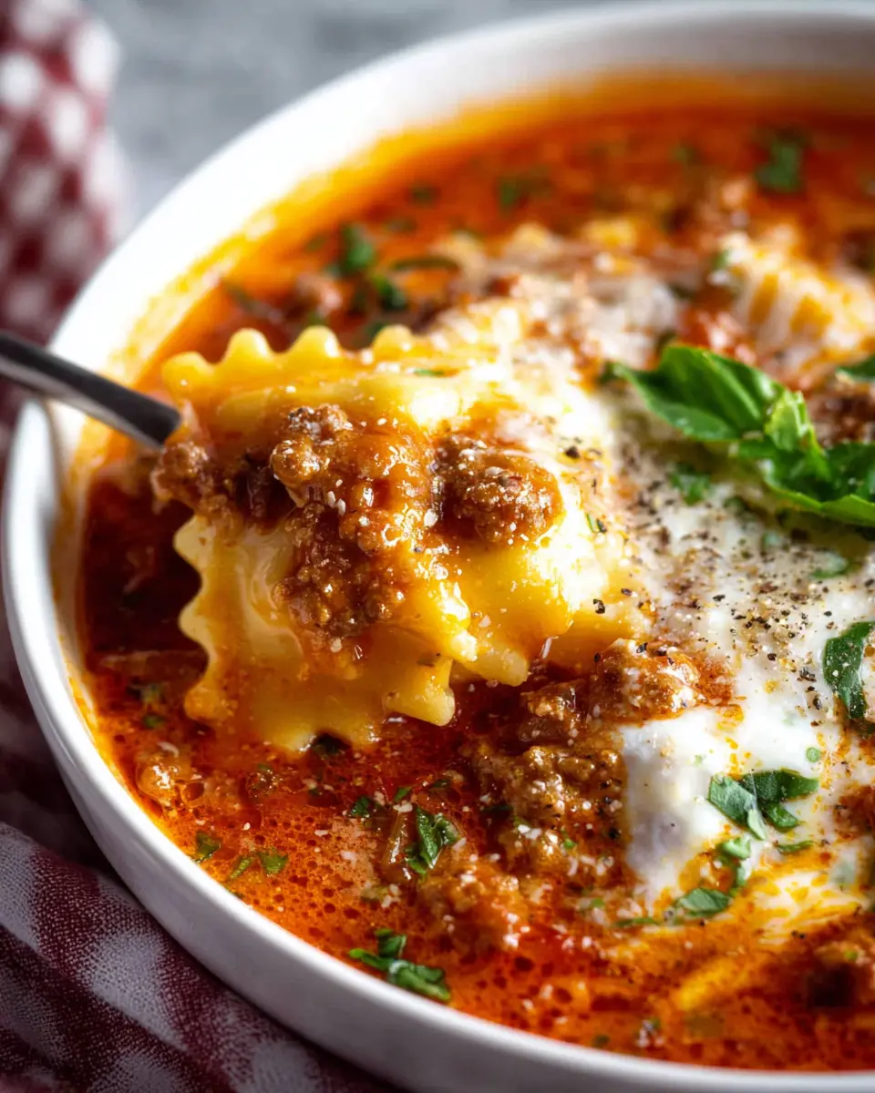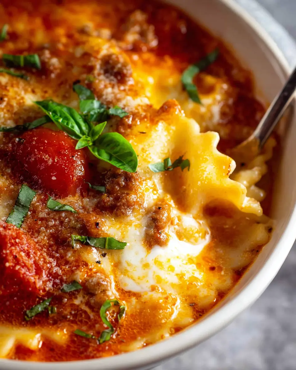 In a small bowl, combine 10 ounces of ricotta cheese, 1 cup of shredded mozzarella, and ½ cup of freshly grated Parmesan cheese. Once your soup is ready, ladle it into bowls and dollop a serving of this cheesy mixture on top. Garnish with fresh basil for that restaurant-quality finish. And there you have it—a comforting and flavorful lasagna soup that’s sure to please everyone around your table!