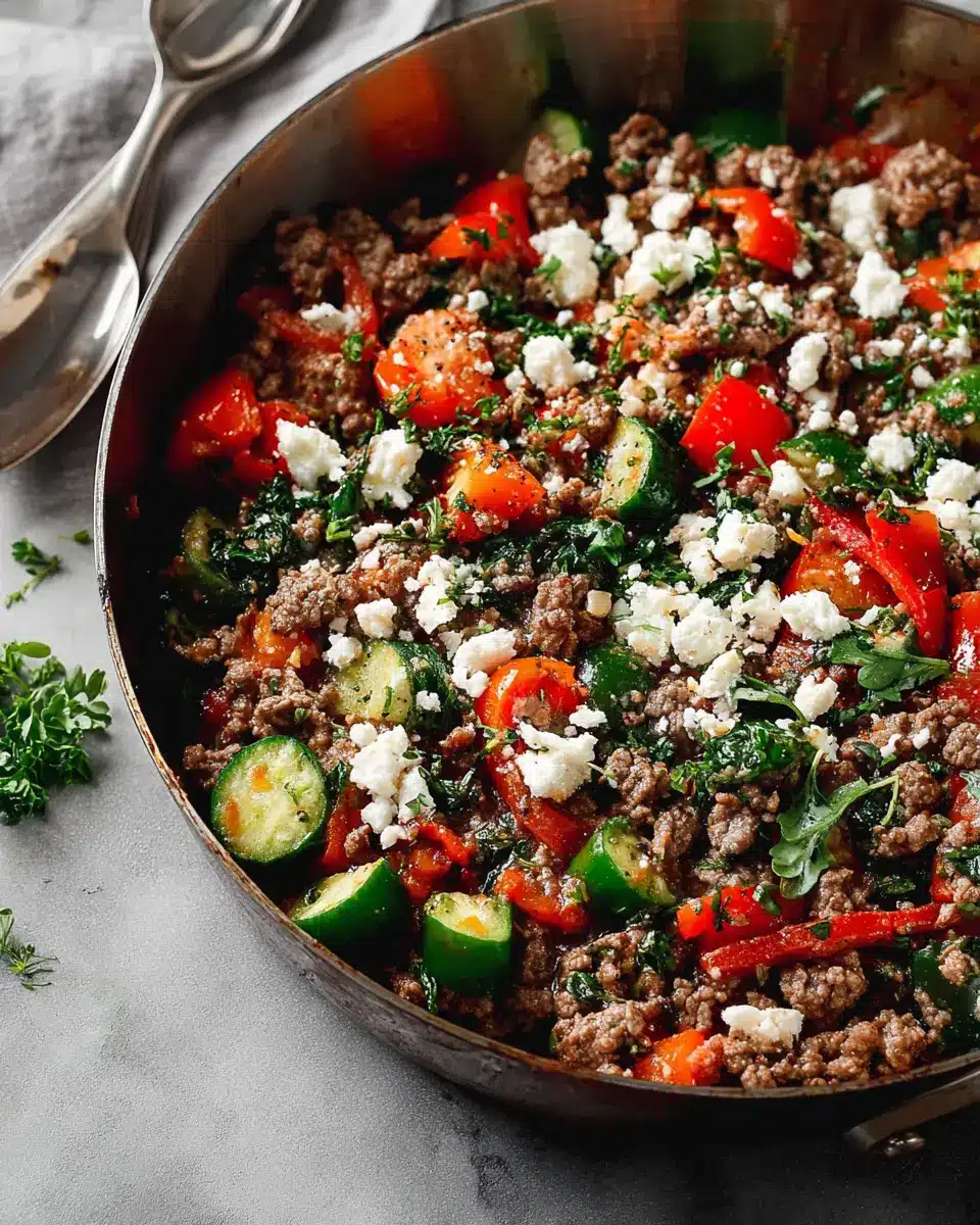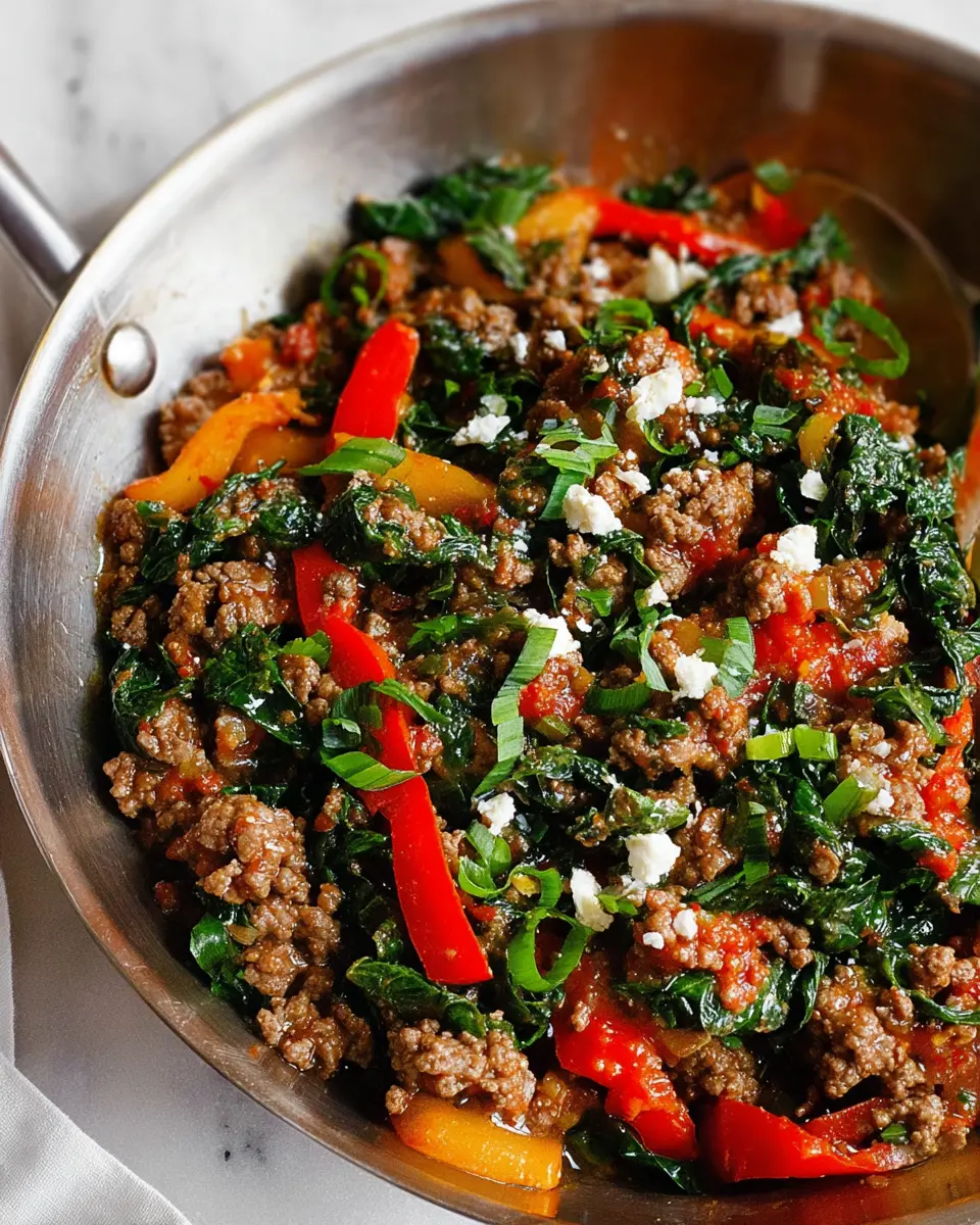 To elevate your Mediterranean Ground Beef Stir Fry, don’t hesitate to experiment with seasonings. Consider adding a sprinkle of red pepper flakes for a spicy kick, or toss in some kalamata olives for a briny depth. If you want an extra touch of freshness, a squeeze of lemon juice right before serving can do wonders! You can also substitute spinach with other greens, like kale or fresh herbs to customize the flavor.