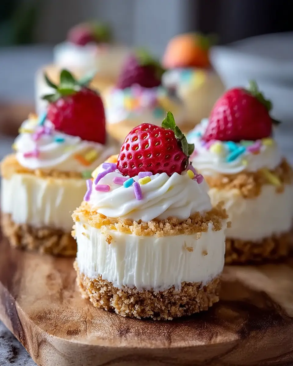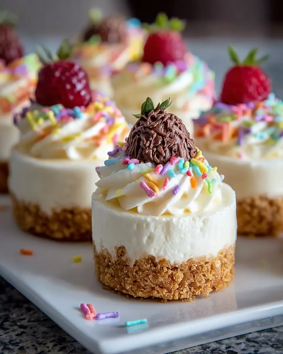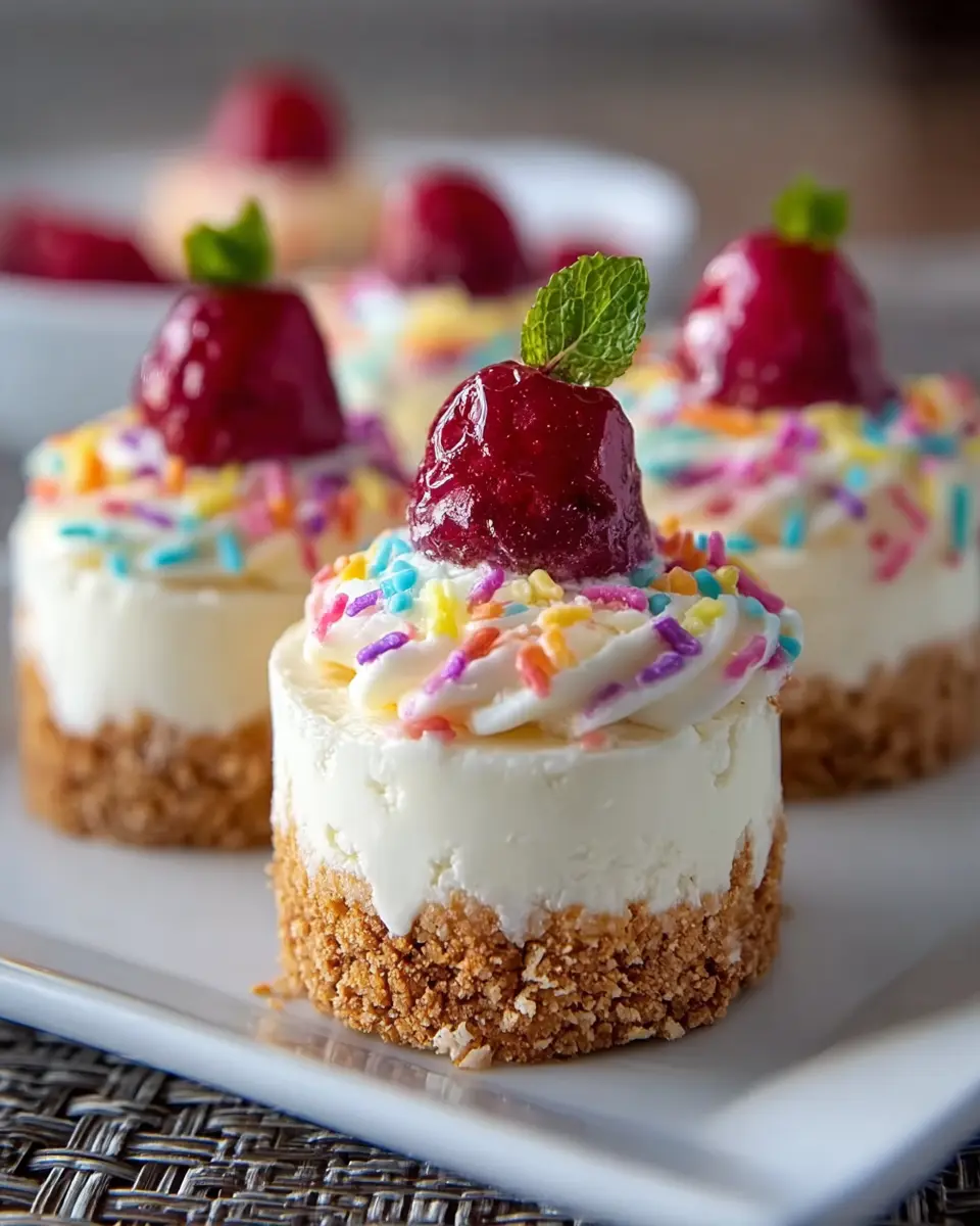 Feel free to top your beautiful creations with sprinkles or candies right before serving, adding a pop of color and fun! Now you’re ready to enjoy these no-bake mini cheesecakes; perfect for any occasion!