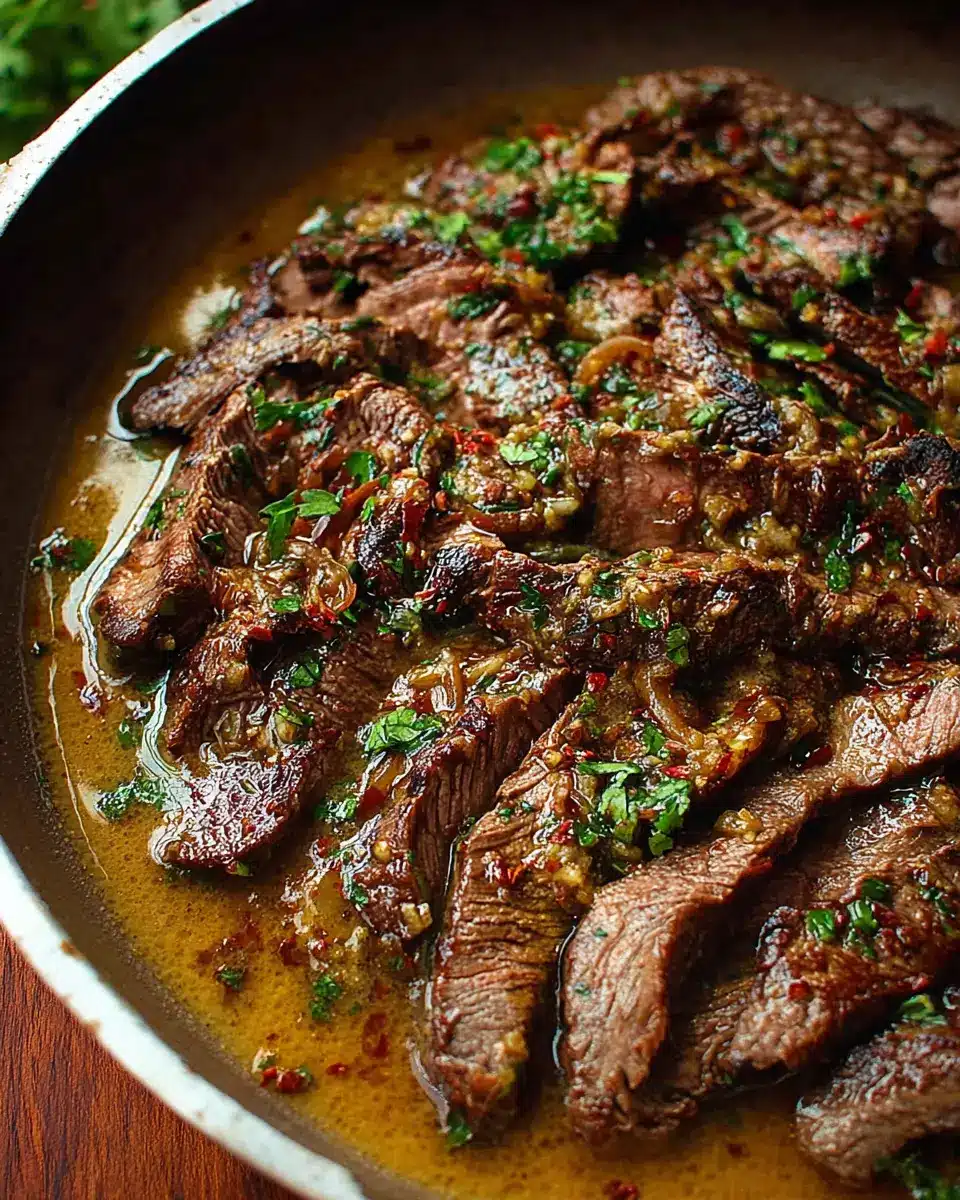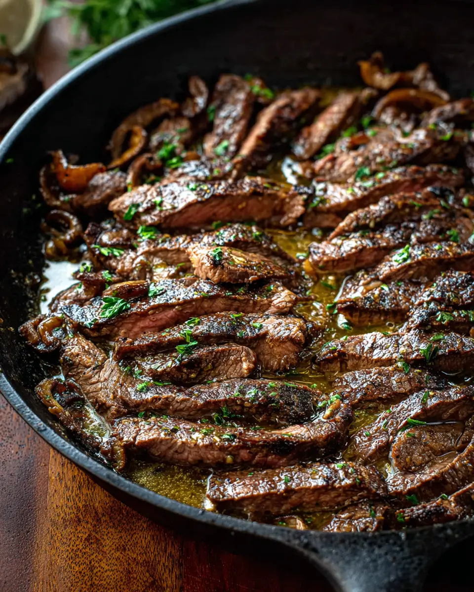 Finally, return the perfectly cooked flank steak strips to the skillet and toss them in the glorious butter sauce, ensuring they’re evenly coated. Allow everything to warm together for a minute, then take a moment to appreciate the aroma wafting through your kitchen. Garnish with freshly chopped parsley before serving.