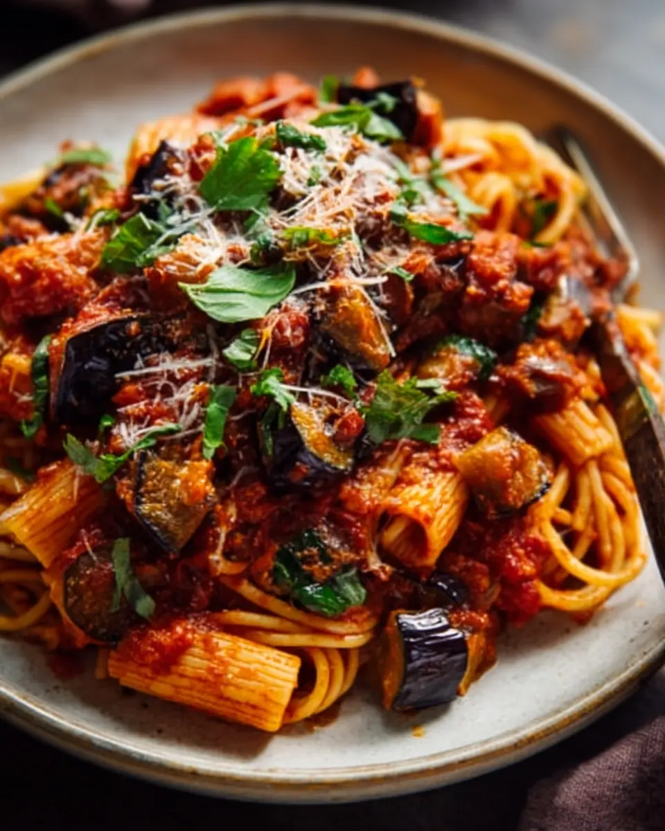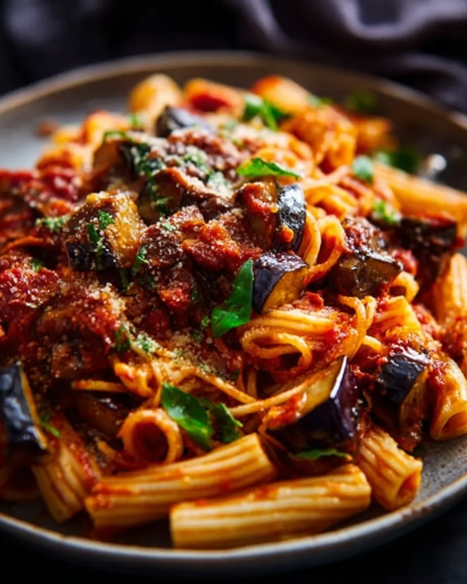 Now, it’s time for the pièce de résistance! Gently fold the roasted eggplant into the sauce, and then add the drained pasta. Toss everything together carefully, ensuring that the eggplant doesn’t mush but rather blends beautifully with the sauce. Serve immediately, garnished with a generous sprinkle of fresh basil and a grating of Parmesan cheese.
