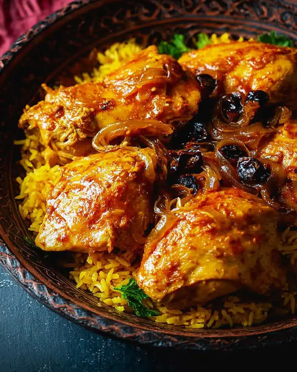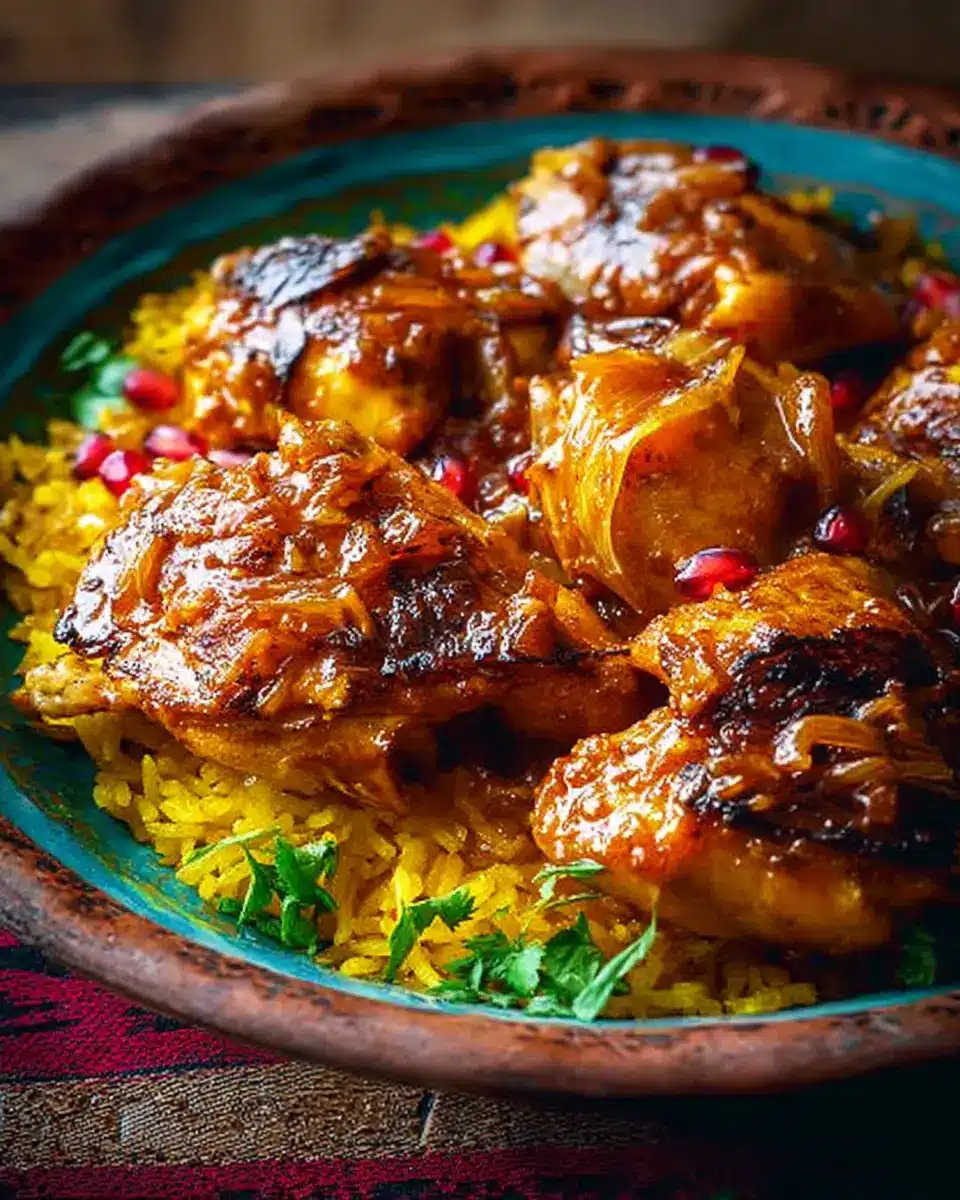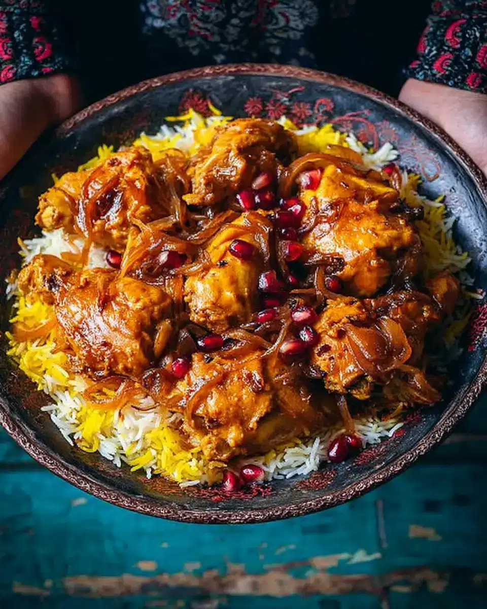 - Pour the saffron water over the chicken along with the fried onion mixture and the dried barberries.