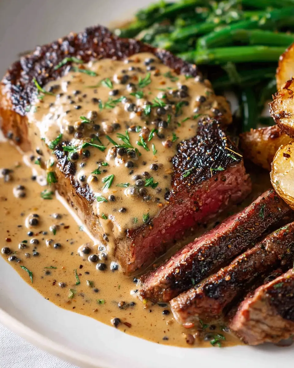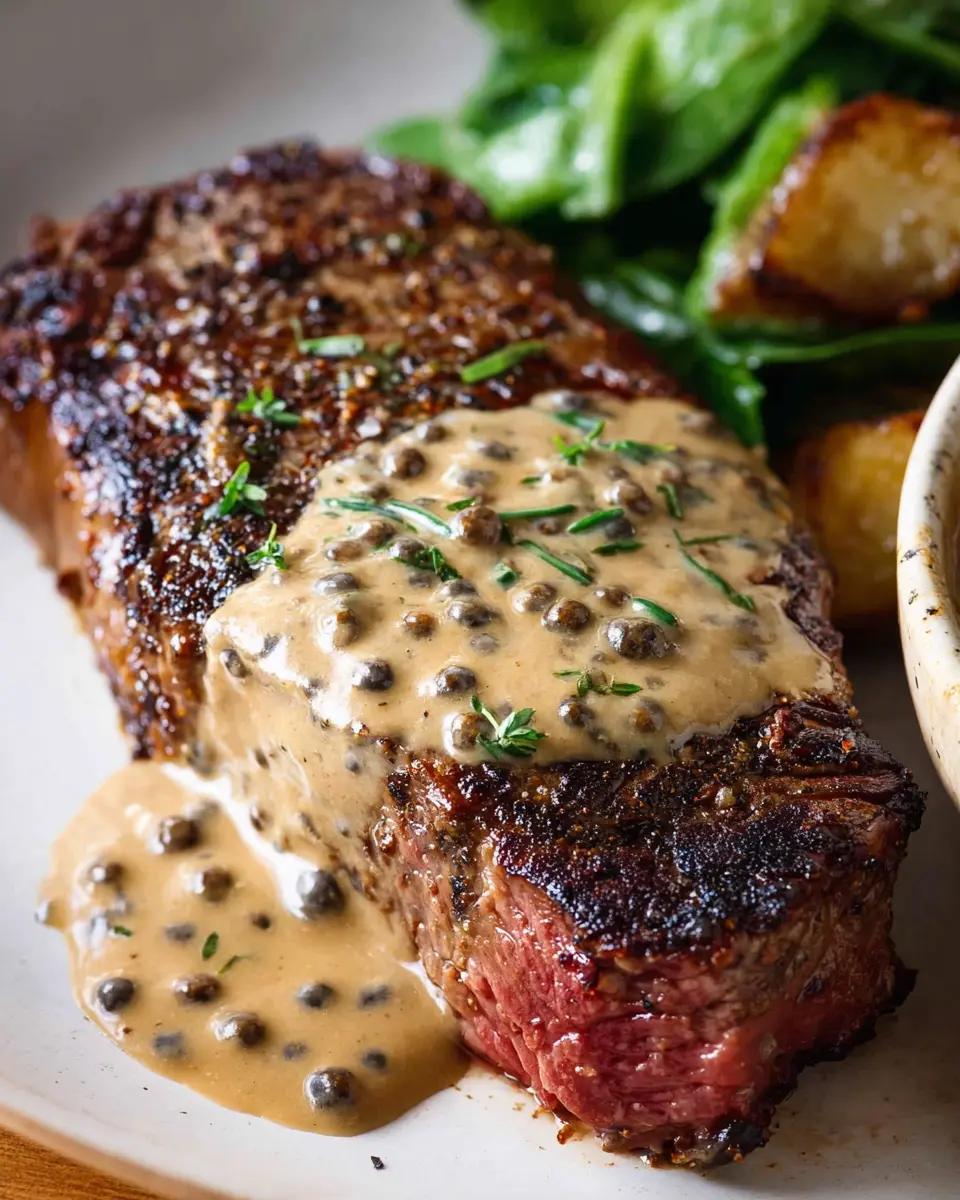 It’s time for the grand finale! Place your rested steaks on warmed serving plates, spoon over that lusciously creamy peppercorn sauce, and get ready for the compliments. For a complete meal, pair this dish with some crispy smashed potatoes or sautéed garlic spinach — they complement the steak beautifully.