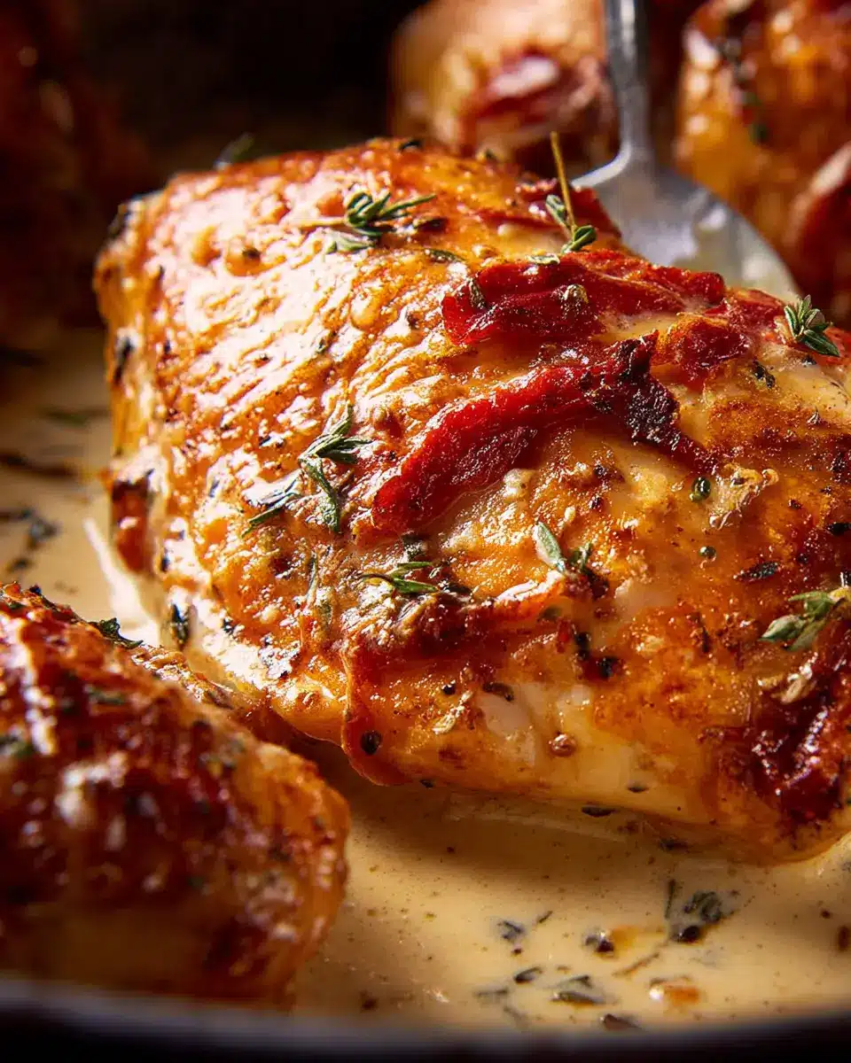 In the same skillet, you’ll use that lovely residual flavor. Lower the heat to medium and add the remaining 2 tablespoons of olive oil. Stir in the finely chopped garlic, fresh thyme, and crushed red pepper flakes—let those aromas mingle for about a minute. This is where the magic begins! Next, add the chicken broth, sun-dried tomatoes, heavy cream, and grated Parmesan. Don’t forget a pinch of salt to taste. Allow this to simmer, and soon enough, you’ll have a sauce that’s begging for chicken!