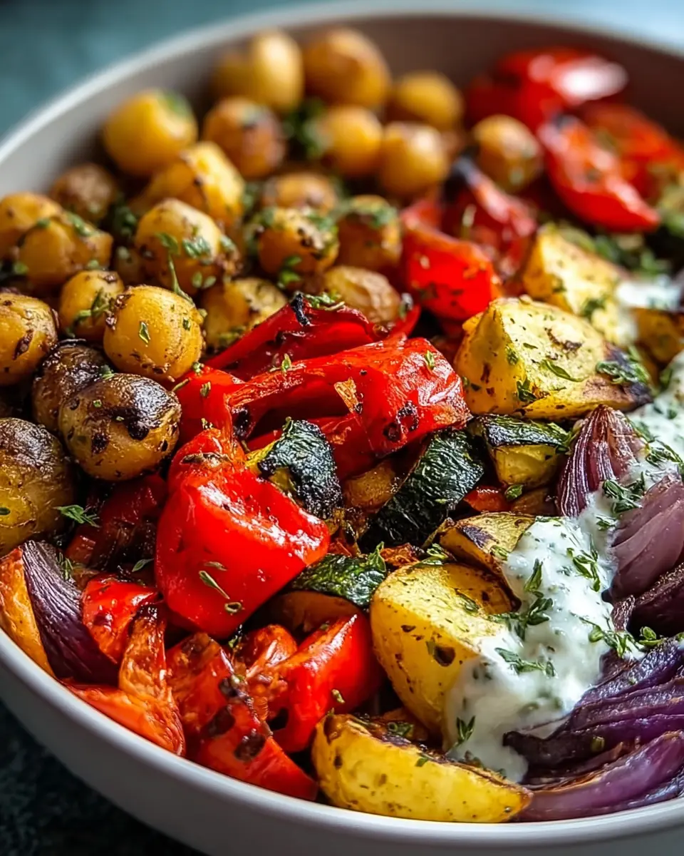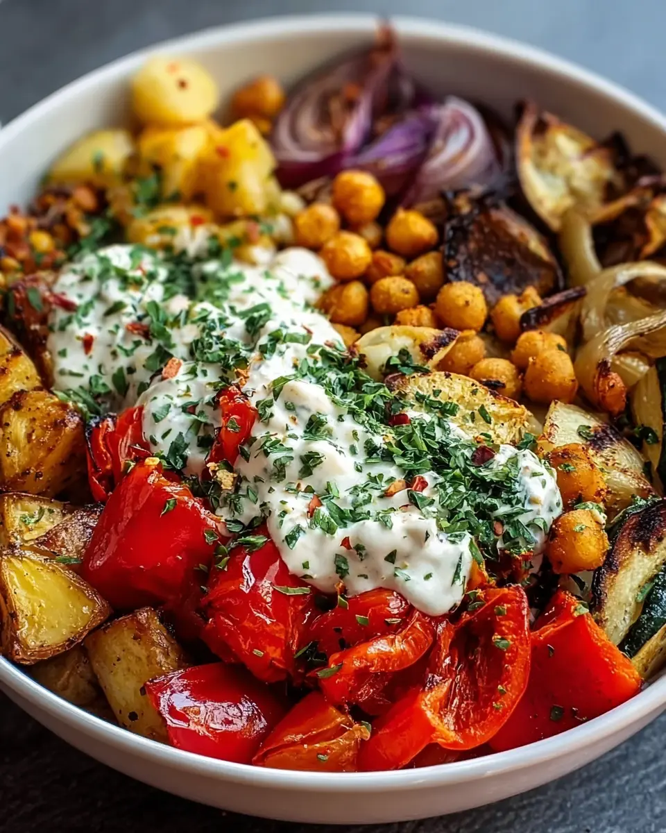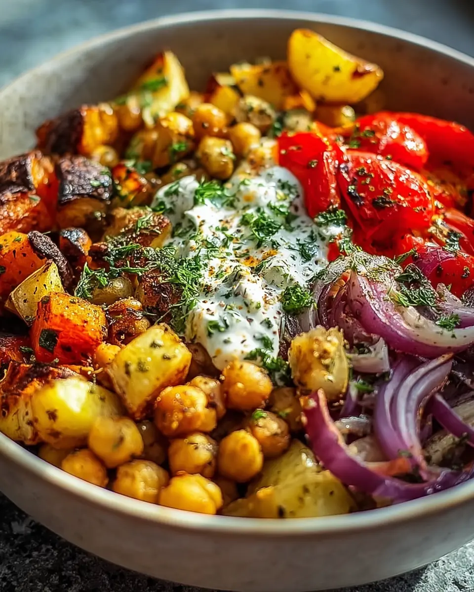 Now comes the fun part: assembling your Vegan Mediterranean Roasted Vegetable Bowl! Start by smearing some plant-based yogurt at the bottom of your bowl—it adds a creamy, tangy layer that beautifully contrasts with the roasted veggies. Layer in your Yukon Gold potatoes, followed by the bell peppers, onions, and those perfectly crunchy chickpeas. Finish off with a sprinkle of fresh herbs and a dash of smoked paprika or red pepper flakes for that extra kick.